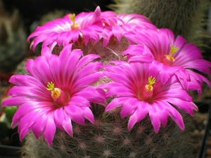 covers these short, round plants; each year, these chubby cacti also develop a crown of purple flowers followed by