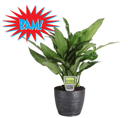 This hulk of a plant is tough as nails but has a soft side: its rich green leaves are patterned with silver splotches, splashes, and spots. And occasionally, he sends up calla-lily-like blooms (when it lives in a spot where it gets enough light). Plants tolerate low light but grow well in bright spots. Add some BAM! to every room with Chinese evergreen. Small plants can fit on desks, side tables, and even dining room tabletops. Larger plants can sit on the floor -- adding lush greenery to any room. Chinese evergreen is a well-behaved slow grower so he won’t lose control and burst out of his container. Considering his burly good looks, Chinese evergreen doesn’t take a lot of care: water once every few weeks. You don’t even need to fertilize, but if you want to, once a year in spring or summer will keep him green and mean.