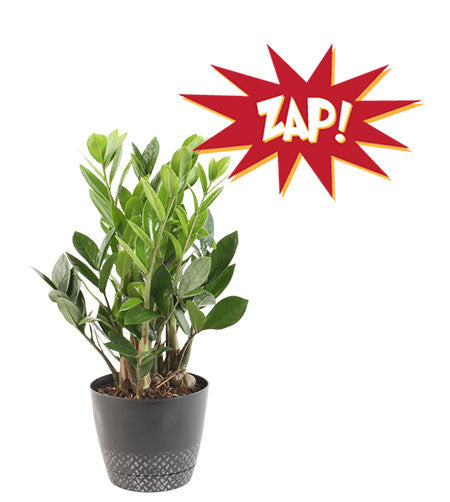 This tough customer is a favorite office plant because it doesn’t need to grow in natural light -- just set it under fluorescent lights and it will stay satisfied. ZZ could care less if forget to water him -- he can go for weeks without a drink. He’ll even let you know when you’ve ignored him long enough; he’ll drop a leaf or two to conserve moisture -- that’s your cue to top him off. You can water him more often -- when his soil feels dry, but no harm, no foul if you forget every once in awhile. Add a little ZAP! to any room in the house with ZZ’s upright growing, big-leaf good looks.