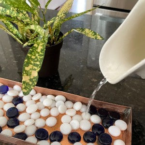 -- Fill the tray with water so that it surrounds the pebbles. Don’t allow the water level to rise above the pebbles. You don’t want your container sitting in water, you want the container to be sitting above the water.