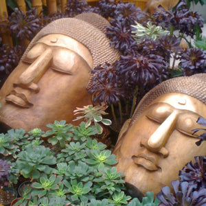 Create a focal point. Setting a statue into a garden draws in the eye. The simple placement of an object transforms an unorganized bed into a garden. At left, two ceramic heads placed into a bed of succulents create a memorable centerpiece.
