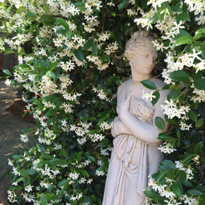 Set a romantic tone. Human figures (children, women) add a touch of Old World beauty to a garden bed. You can surround statuary with romantic plants as well, such as fragrant Confederate jasmine around a classical woman, at left.