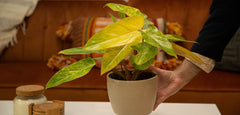 Philodendron Painted Lady is a spectacular climbing houseplant that features bold variegated foliage and an easy-care nature. This makes it a top choice for beginners and experienced plant parents alike. Each new leaf emerges a golden-yellow color with chartreuse speckling. As the leaves age, the golden yellow goes to light green and the chartreuse becomes a deeper green color. Pink petioles add to the overall look.