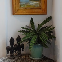 Calathea hails from Brazil (you can almost hear faint salsa music when you behold the wacky leaves). Calathea goes by a number of descriptive names (rattlesnake plant, peacock plant). And it’s a hot little number that adds instant pizzazz to a room. Here it is in my living room, left, where it hangs out in a shaded corner, getting just enough sun to keep its leaves vibrant. But not too much sun to annoy it; calatheas do not like bright sunlight.