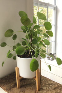 It’s easy-care too. Pilea Sharing Plant™ likes indirect sun (never direct sun), soil on the drier side (never soggy), and plants enjoy a little nip of fertilizer every 6 months or so. To keep your Pilea Sharing Plant™ symmetrical, rotate the plant occasionally. (Plants have the tendency to grow toward light, an action called phototropism.)