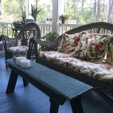 My vacation souvenir became the new covering for a vintage wicker couch and chairs. My mom, who is a whiz on a sewing machine, stitched up 5 fringe-edge pillows. I covered the seats, and in a few hours we’d transformed the set into a tropical Maui beauty.