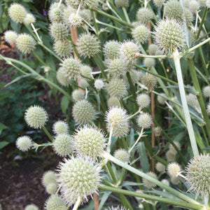 I suspect I like round flowers because there are very few of them. Here’s the short list: globe amaranth, globe thistle, pincushion flower, armeria, echinops, rattlesnake master (in photo), and alliums; these all offer ball-shape blooms.